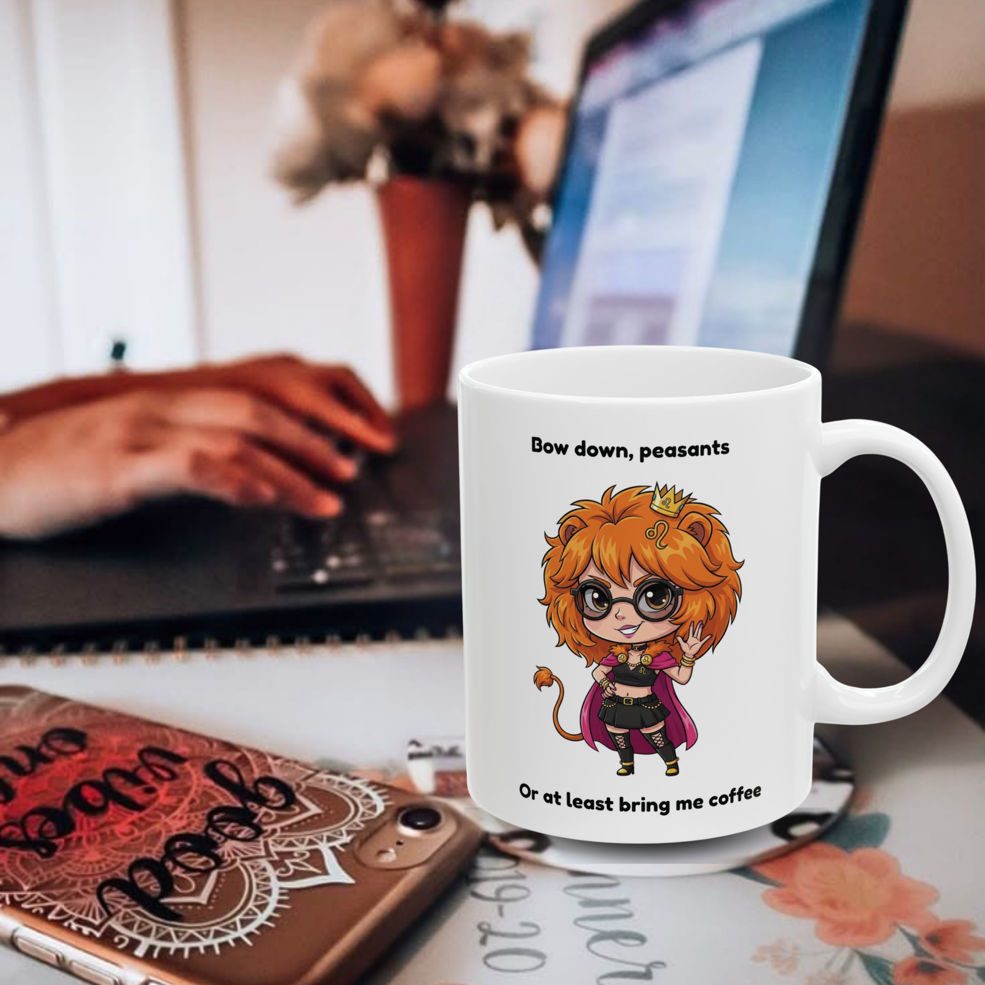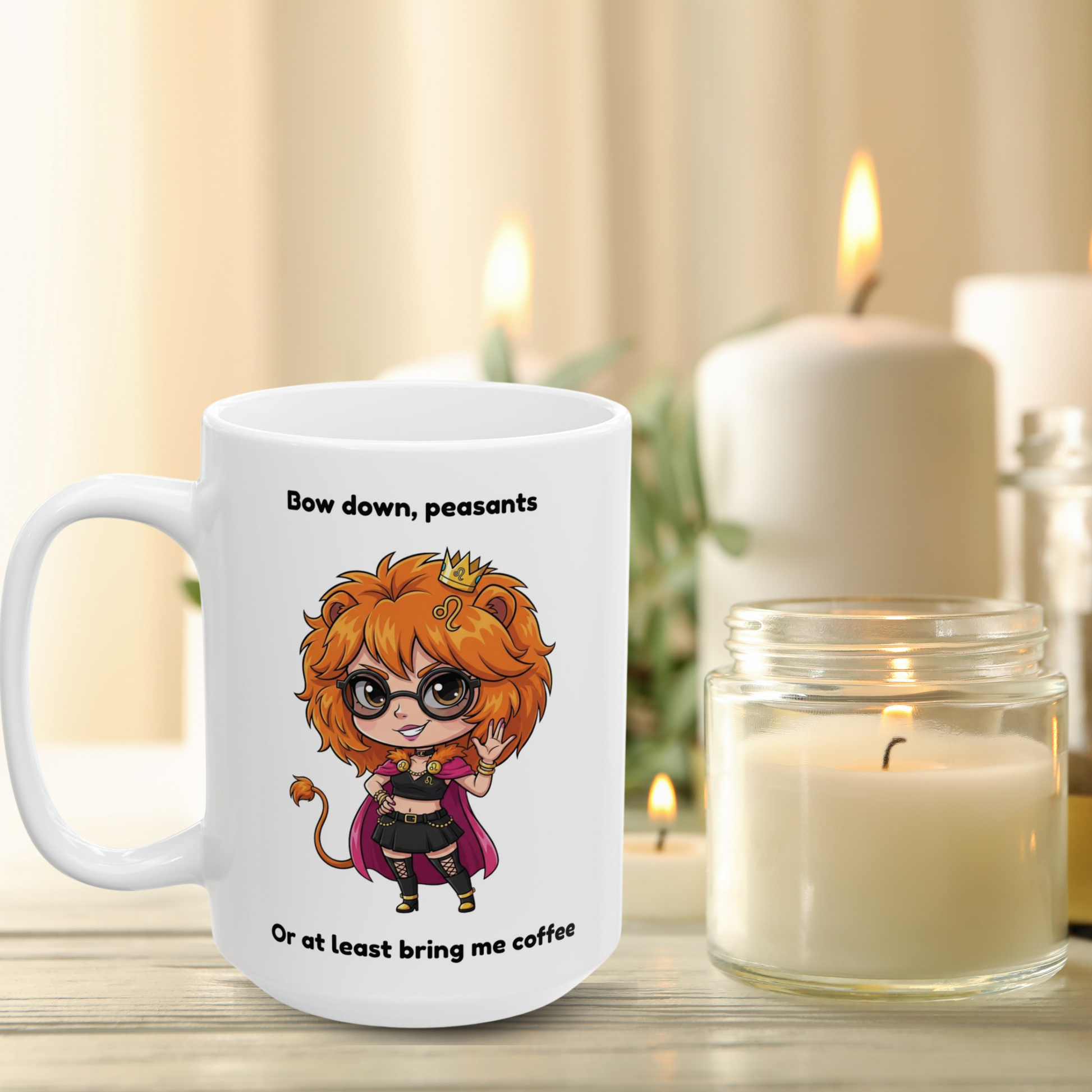 This sarcastic Leo coffee mug perfectly captures your royal personality with a cute edgy aesthetic. Featuring the hilarious quote "Bow down, peasants. Or at least bring me coffee" - because Leo energy is pure main character royalty vibes!